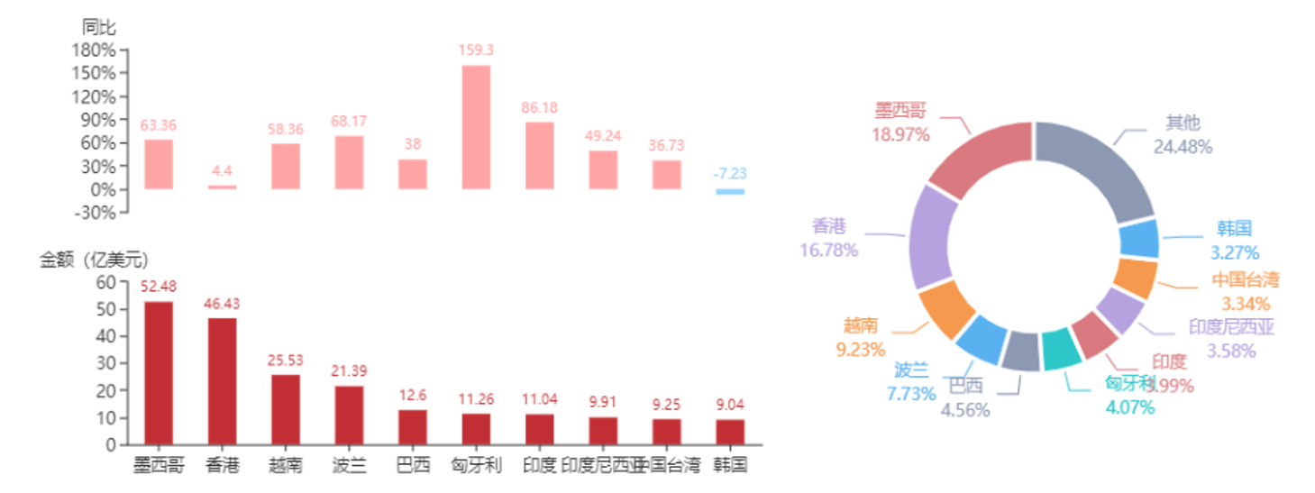 前12個月,墨西哥是我國液晶顯示板出口最主要的市場,出口額為52.48億美元,同比增長63.36%。12月當月,出口額為2.59億美元,同比增長1.45%。