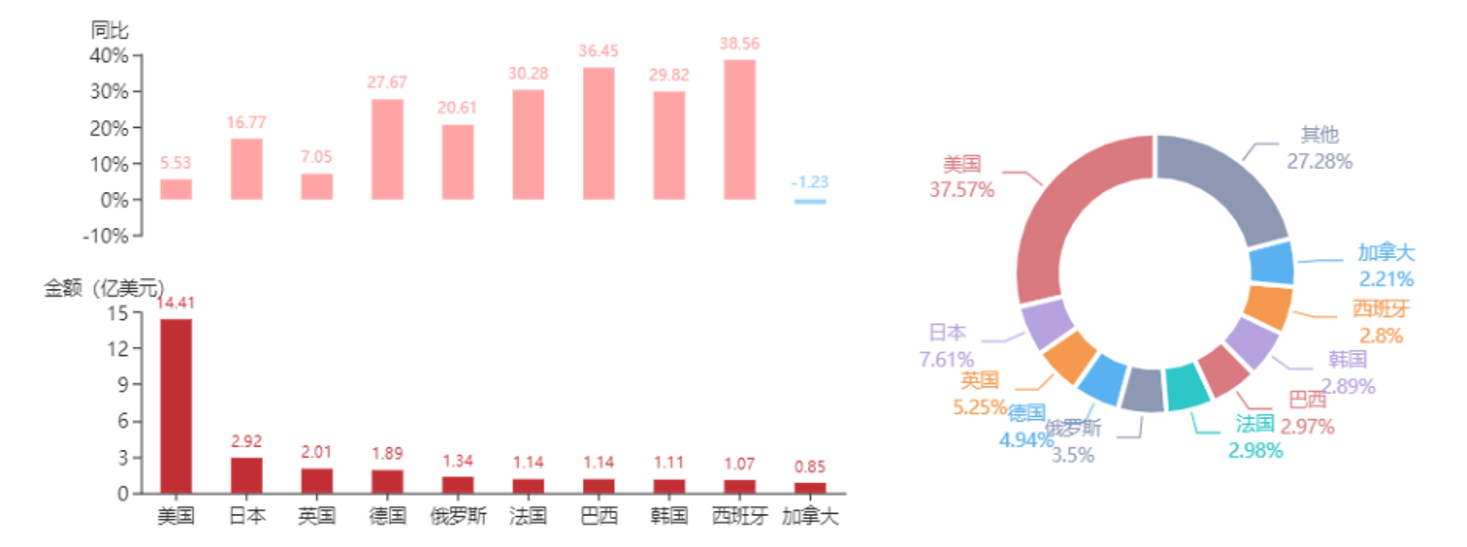前12個月,美國是我國微波爐出口最主要的市場,出口額為14.41億美元,同比增長5.53%。12月當月,出口額為1.54億美元,同比增長46.28%。