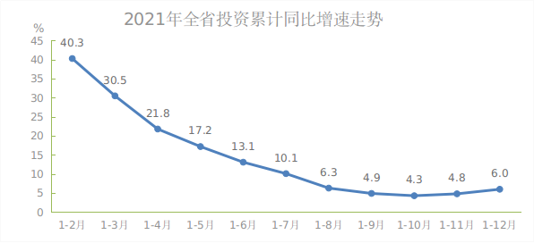 2021年,全省固定資產(chǎn)投資比上年增長(zhǎng)6.0%,增幅比1-11月提高1.2個(gè)百分點(diǎn),與2019年比,兩年平均增長(zhǎng)2.8%。
