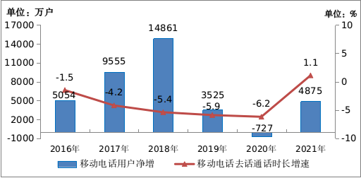 2021年,全國移動短信業務量比上年減少1%,移動短信業務收入比上年增長6.6%,移動短信業務量收增速差從上年的15.4%下降至7.6%。2021年,全國移動電話去話通話時長2.27萬億分鐘,比上年增加1.1%。