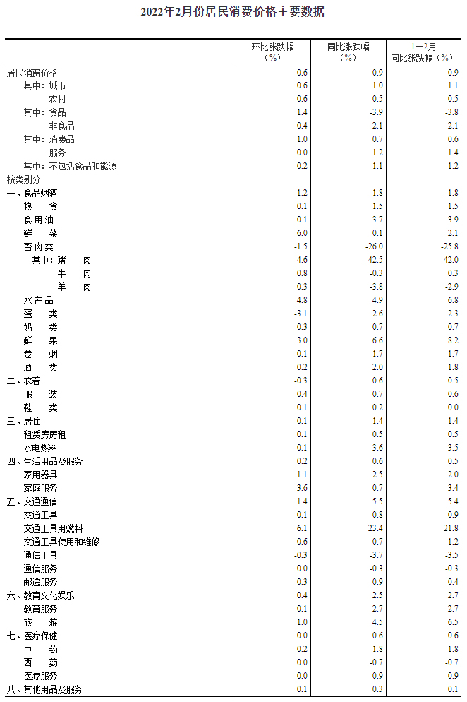 2022年2月份居民消費價格同比上漲0.9% 環比上漲0.6%
