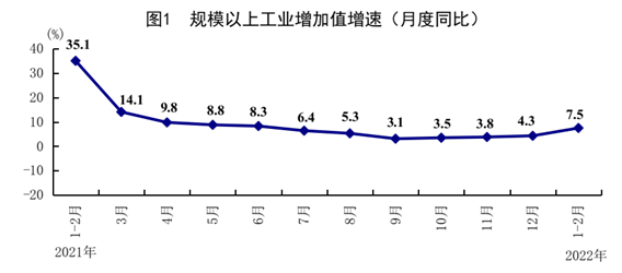 1—2月份,全國規模以上工業增加值同比增長7.5%,比2021年12月份加快3.2個百分點,比2021年兩年平均增速加快1.4個百分點。分三大門類看,采礦業增加值同比增長9.8%,制造業增長7.3%,電力、熱力、燃氣及水生產和供應業增長6.8%。高技術制造業、裝備制造業增加值同比分別增長14.4%、9.6%,增速分別比規模以上工業快6.9、2.1個百分點。分產品看,新能源汽車、工業機器人、太陽能電池產量同比分別增長150.5%、29.6%、26.4%。分經濟類型看,國有控股企業增加值同比增長5.9%;股份制企業增長8.4%,外商及港澳臺商投資企業增長4.2%;私營企業增長8.7%。從環比看,2月份規模以上工業增加值比上月增長0.34%。2月份,制造業采購經理指數為50.2%,比上月上升0.1個百分點;企業生產經營活動預期指數為58.7%,上升1.2個百分點。
