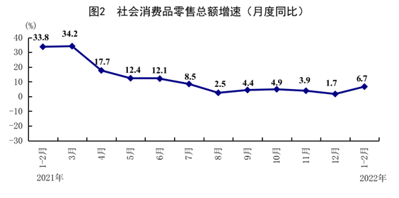 1—2月份,社會消費品零售總額74426億元,同比增長6.7%,比2021年12月份加快5.0個百分點,比2021年兩年平均增速加快2.8個百分點。按經營單位所在地分,城鎮消費品零售額64593億元,增長6.7%;鄉村消費品零售額9833億元,增長7.1%。按消費類型分,商品零售66708億元,增長6.5%;餐飲收入7718億元,增長8.9%。升級類商品銷售較快增長,限額以上單位金銀珠寶類、家用電器和音像器材類、文化辦公用品類商品零售額分別增長19.5%、12.7%、11.1%。基本生活類商品銷售良好,限額以上單位日用品類、糧油食品類商品零售額分別增長10.7%、7.9%。全國網上零售額19558億元,同比增長10.2%。其中,實物商品網上零售額16371億元,增長12.3%,占社會消費品零售總額的比重為22.0%。從環比看,2月份社會消費品零售總額比上月增長0.30%。