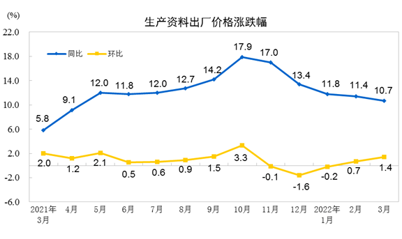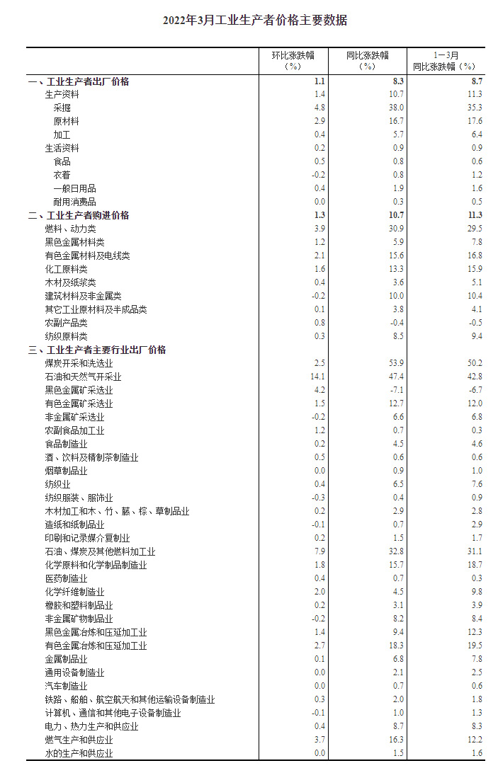 2022年3月份工業(yè)生產(chǎn)者出廠價格同比上漲8.3% 環(huán)比上漲1.1%