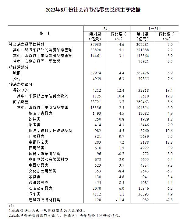 按消費類型分,8月份,商品零售33721億元,同比增長3.7%;餐飲收入4212億元,增長12.4%。1—8月份,商品零售269463億元,同比增長5.6%;餐飲收入32818億元,增長19.4%。