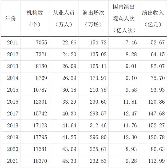 表1:2011-2021年全國藝術表演團體基本情況