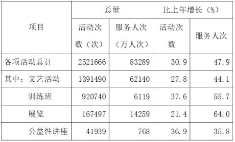 全年全國群眾文化機構共組織開展各類文化活動252.17萬場次,比上年增長30.9%;服務人次83289萬,增長47.9%。