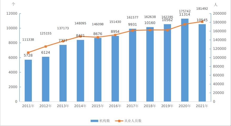 圖5:2011-2021年全國文物機構及從人員情況