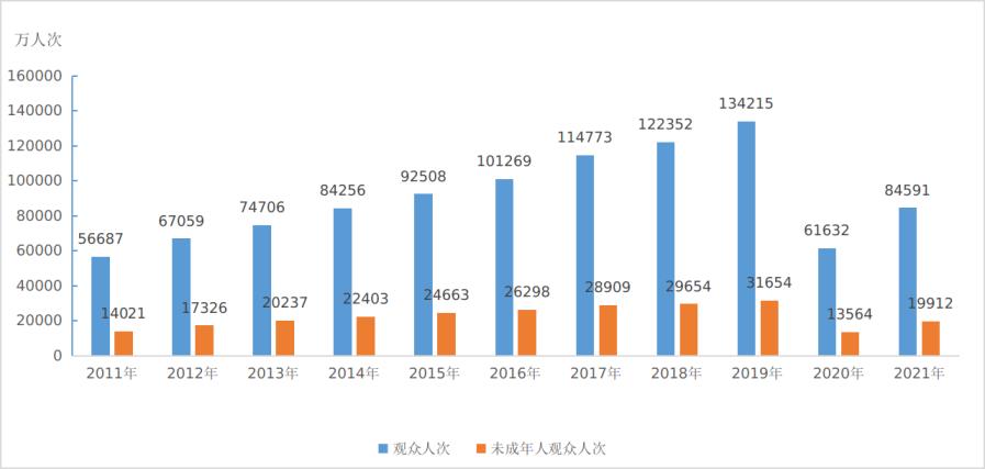 圖6:2011-2021年全國文物機構接待觀眾人次及未成年人觀眾人次