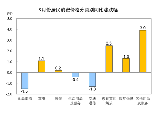 9月份,食品煙酒類價格同比下降1.5%,影響CPI(居民消費價格指數)下降約0.44個百分點。食品中,畜肉類價格下降12.8%,影響CPI下降約0.45個百分點,其中豬肉價格下降22.0%,影響CPI下降約0.37個百分點;鮮菜價格下降6.4%,影響CPI下降約0.14個百分點;水產品價格下降1.5%,影響CPI下降約0.03個百分點;鮮果價格下降0.3%,影響CPI下降約0.01個百分點;蛋類價格上漲0.7%,影響CPI上漲約0.01個百分點;糧食價格上漲0.7%,影響CPI上漲約0.01個百分點。