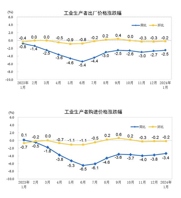 核心提示:2024年1月份,受國際大宗商品價格波動影響,全國工業生產者出廠價格同比下降2.5%,環比下降0.2%,降幅比上月分別收窄0.2和0.1個百分點;工業生產者購進價格同比下降2024年1月份,受國際大宗商品價格波動影響,全國工業生產者出廠價格同比下降2.5%,環比下降0.2%,降幅比上月分別收窄0.2和0.1個百分點;工業生產者購進價格同比下降3.4%,降幅收窄0.4個百分點,環比下降0.2%,降幅與上月相同。