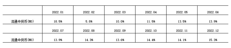 注4:自2022年12月起,“流通中貨幣(M0)”含流通中數字人民幣。12月末流通中數字人民幣余額為136.1億元。修訂后,2022年各月末M1、M2增速無明顯變化。修訂后M0增速如下: