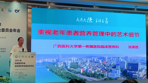 廣西醫(yī)科大學(xué)第一附屬醫(yī)院營養(yǎng)科主任張勇勝教授,則向與會者闡述了《重視老年患者營養(yǎng)管理中的藝術(shù)細(xì)節(jié)》,重點剖析了吞咽障礙對中老年人的危害、臨床特征、評估方法以及治療方案等。