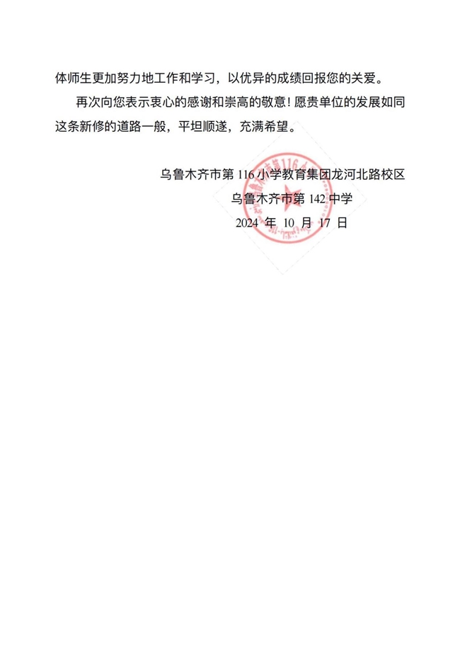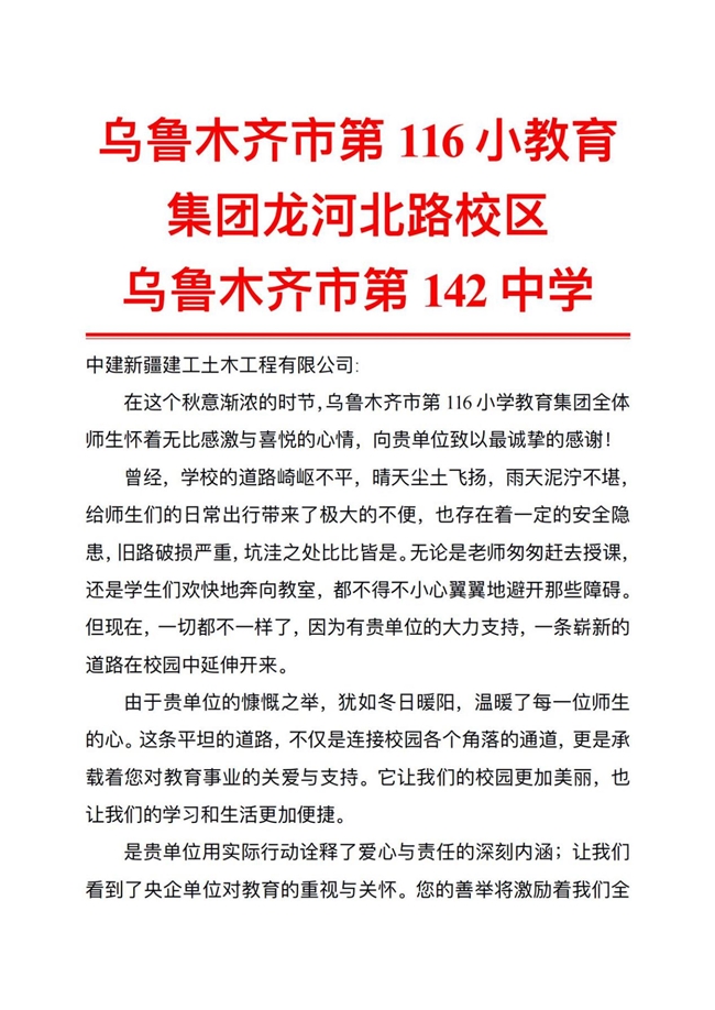核心提示:10月22日,中建新疆建工土木工程有限公司米東區(qū)水龍灣項(xiàng)目收到來自烏魯木齊市第116小學(xué)教育集團(tuán)送來的錦旗和感謝信,對(duì)項(xiàng)目部為方便師生出行修繕道路表示感謝。10月22日,中建新疆建工土木工程有限公司米東區(qū)水龍灣項(xiàng)目收到來自烏魯木齊市第116小學(xué)教育集團(tuán)送來的錦旗和感謝信,對(duì)項(xiàng)目部為方便師生出行修繕道路表示感謝。