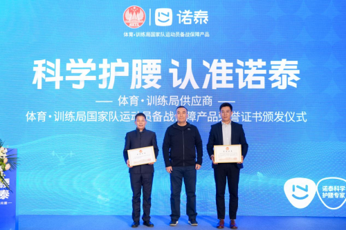 發布會中,國家體育總局訓練局代表與諾泰品牌代表簽署了戰略合作協議。隨后,國家體育總局訓練局事業發展處處長陸煜為諾泰品牌代表頒發了“體育·訓練局供應商”及“體育·訓練局國家隊運動員備戰保障產品”榮譽證書,標志著雙方正式建立長期穩定的合作伙伴關系。