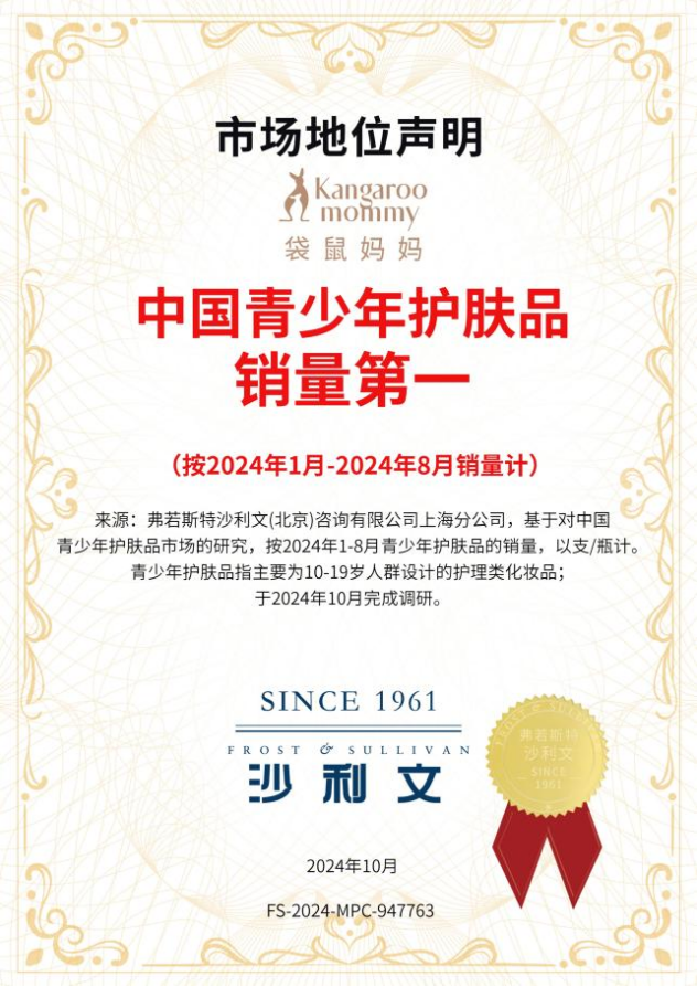 據國際市場調研機構沙利文認證,袋鼠媽媽2024年1-8月份的青少年護膚品市場銷量第一。嚴二平表示,在銷量背后是對產品和服務的認可,更是對品牌的信任和口碑。
