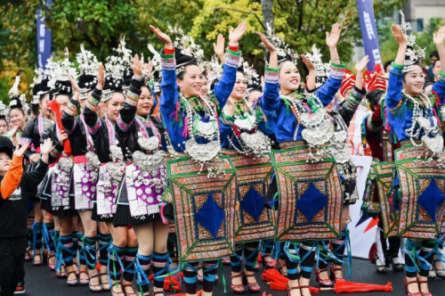 最炫民族風的服飾:來到黔東南,觀看苗族盛裝表演是必不可少的,各支系苗族同胞將身著盛裝,組成方陣,在賽道兩旁用游演的形式,向遠道而來的運動員們展示黔東南獨特的多樣性苗族服飾文化精髓。色彩強烈的民族風服裝和眼花繚亂的民族風配飾,將裝點成一條“民族時尚”之路。