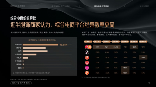 服飾商家首選經營陣地包括淘寶天貓、京東、拼多多、抖音。從利潤率角度來看,利潤大于20%的商家,淘寶占比最高;盈利但利潤小于10%的商家,拼多多最多。