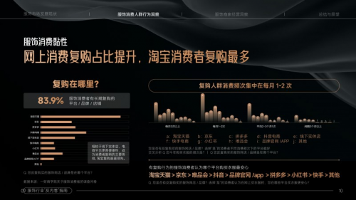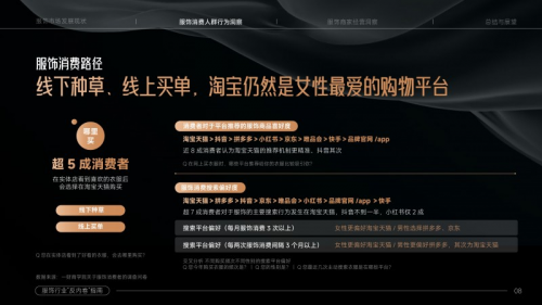 有超過5成的消費者在實體店看到喜歡的衣服后,并不會直接現場買單,而是轉移去淘寶天貓購買。在線上買衣服時,消費者會主動搜索、或是根據平臺推薦來篩選,兩種路徑下,淘寶天貓均是消費者首選。