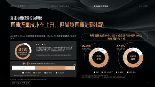 近7成商家都以直播拓展生意增量,流量成本增加的同時,利潤仍有較大的提升空間:布局直播的商家中,近6成店鋪利潤低于10%、未布局的為4成。