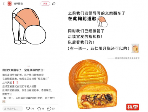 隨后,桃李更進一步發布了自黑式道歉廣告:“之前我們領導寫的文案翻車了,在此道歉。同時我們已經接管了后續宣發的指揮權,以后看我們的!(有一說一,五仁蛋月燒還可以的) —— 桃李市場部瑞思拜全體寶子”。