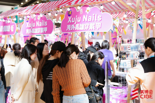 小品類蘊藏大商機,美甲美睫紋繡市場呈現(xiàn)出強勁的增長勢頭,展區(qū)集中展示了穿戴甲、甲油膠、美甲工具、美甲貼紙、配飾及配套等熱門高增長品項。其中穿戴甲創(chuàng)業(yè)風潮持續(xù)高漲,門店加盟迅速擴張,成為展會現(xiàn)場的一大焦點。