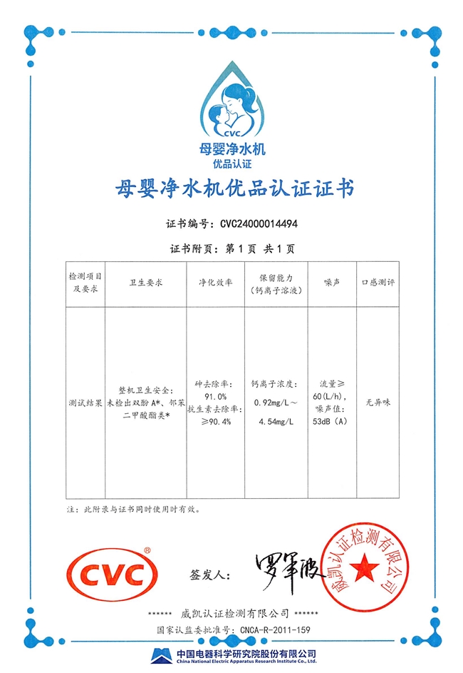 經(jīng)過(guò)“CCLC中輕聯(lián)”“CVC威凱檢測(cè)”雙檢測(cè)機(jī)構(gòu),總共檢測(cè)600+項(xiàng)目,分別頒發(fā)母嬰級(jí)凈水機(jī)認(rèn)證。雙檢共證 方顯權(quán)威!確保水質(zhì)安全!