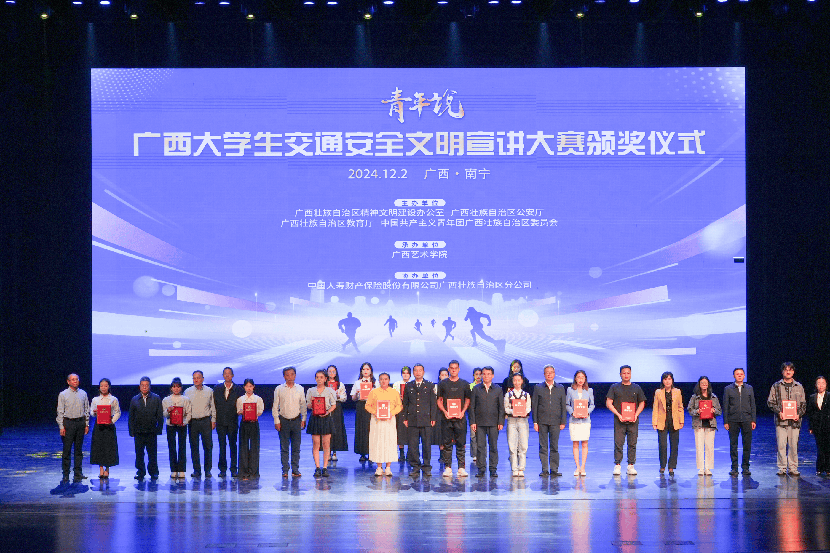 在2024年第一屆“青年說”廣西大學生交通安全文明宣講大賽活動現場,從246支高校復賽隊伍中脫穎而出進入區級總決賽的20支參賽隊伍圍繞自身經歷,用“小故事”傳播交通安全理念,從“小切口”剖析交通安全知識,充分展現了青年學生群體挺膺擔當的使命感、責任感、歸屬感和榮譽感,中國人壽財險廣西分公司黨委書記、總經理同主辦方相關領導共同為獲獎的師生頒獎。