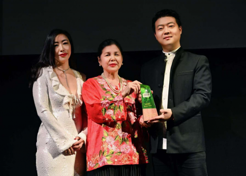 圖為TVE全球可持續發展電影獎主席Mei Sin OBE(中)、亞太地區榮譽主席Helen Wang(左)向出品人兼編劇王欽甲(右)頒發本屆英國TVE全球可持續發展電影獎“評審團特別獎”。