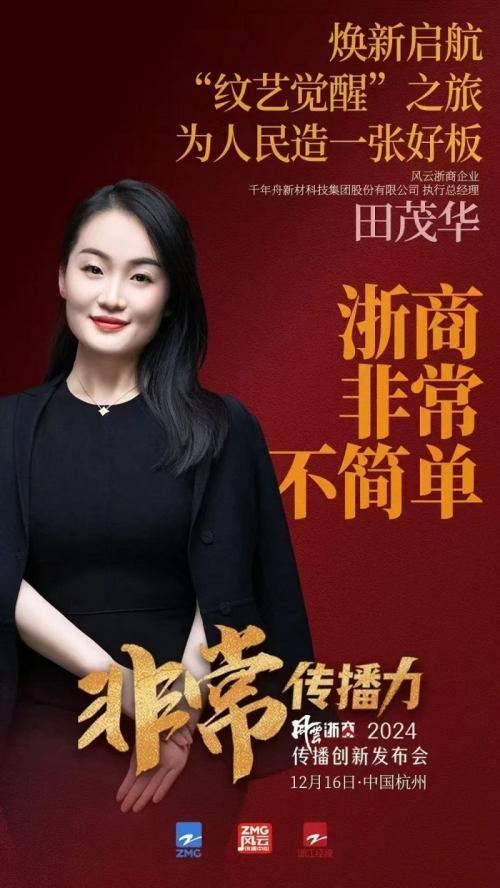 以“非常”之力,創“非凡”之勢。12月16日,由浙江廣播電視集團主辦,ZMG風云傳播中心承辦的《非常傳播力——2024風云浙商傳播創新發布會》在杭州隆重召開,千年舟集團執行總經理田茂華作為風云浙商企業代表受邀出席本次大會,通過對話分享,共話行業發展方向。