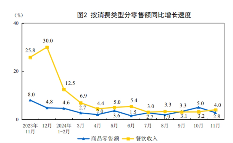 按消費類型分,11月份,商品零售額37961億元,同比增長2.8%;餐飲收入5802億元,增長4.0%。1—11月份,商品零售額392554億元,增長3.2%;餐飲收入50169億元,增長5.7%。