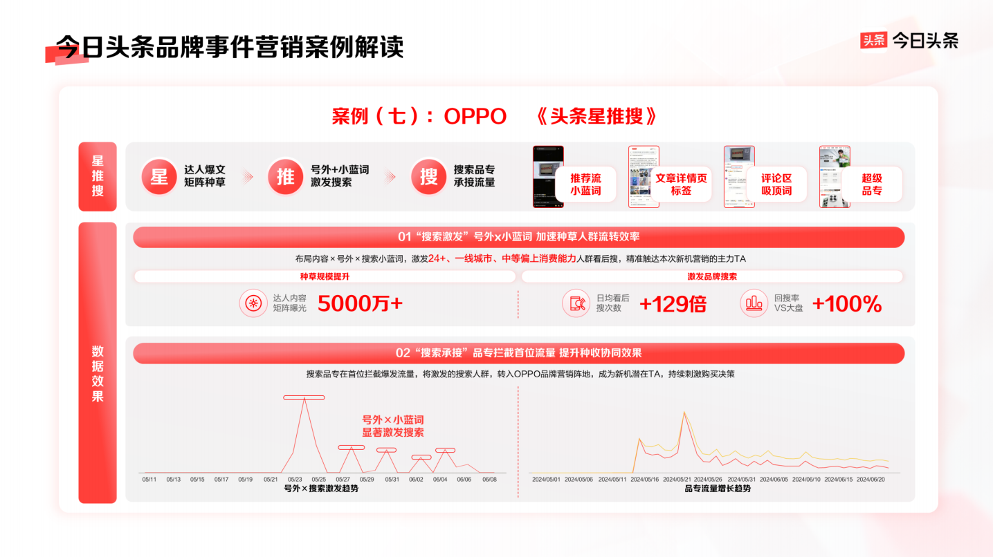 如OPPO新機上線。今日頭條配合品牌布局頭條星推搜,針對性觸達24+、一線城市、中等偏上消費能力人群,激發其看后搜動作。通過達人爆文矩陣種草、號外+小藍詞激發搜索、搜索品專承接流量,層層遞進,協助OPPO新機獲得5000萬+曝光,激發日均看后搜次數增長129倍、回搜率對比大盤增加100%。今日頭條幫助品牌在新品上市期精準觸達高潛用戶人群,搶占先機。
