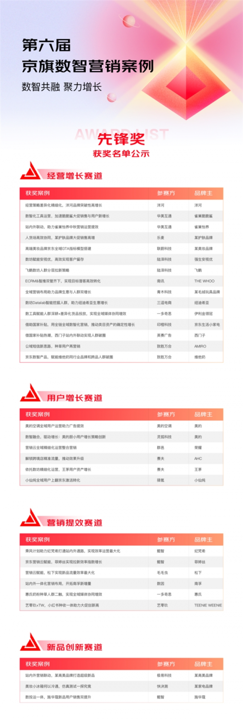 核心提示:12月17日,商家及合作伙伴翹首以待的“第六屆京旗數智案例大賽”獲獎名單正式出爐!58個案例基于京東DAAS,持續創新經營理念、不斷探索增長路徑,成為“數智共融,聚力增長”的新標桿。12月17日,商家及合作伙伴翹首以待的“第六屆京旗數智案例大賽”獲獎名單正式出爐!58個案例基于京東DAAS,持續創新經營理念、不斷探索增長路徑,成為“數智共融,聚力增長”的新標桿。 由京東數智業務聯合發起的京旗數智案例大賽,在今年京東11.11,來到了第六屆。第六屆京旗數智案例大賽,賽道全面升級升級,通過經營增長、用戶增長、營銷提效、新品創新四大場景,見證品牌及合作伙伴用數智化方式,在不確定性環境的挑戰下獲得確定性的增長。 在第六屆京旗數智案例大賽的獲獎案例中,有28個案例斬獲金獎,30個案例斬獲先鋒獎。具體名單如下: