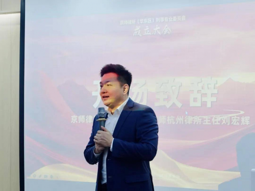 大會伊始,北京市京師律師事務所創始合伙人、京師杭州律師主任劉宏輝作開場致辭。劉宏輝主任代表京師杭州律所向參會嘉賓致以熱烈歡迎。他強調了刑事業務的價值與重要性,劉宏輝主任表示,處理刑事業務是律師必備的技能要求,也是律師打造個人及團隊影響力的關鍵。刑事業務一直是京師律所的核心業務板塊,劉宏輝主任期許京師律所(華東區)刑委會依托京師總部的支持,整合華東區域各分所及律師行業的優勢資源,共同應對刑事業務領域的挑戰,推動刑事業務朝著更加專業化、精細化的方向發展。