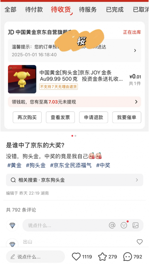 新疆用戶收到京東送出最后一塊“狗頭金” 湖南跨晚黃金大獎已全部送達(dá)
