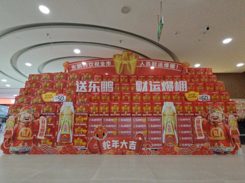 在全國各省市、鄉鎮的商超、加油站、服務區等地方,東鵬飲料的“千箱堆”“萬箱堆”創意堆頭遍地開花。從一線繁華商圈到鄉鎮興旺商超,消費者目之所及,盡是紅火金燦的東鵬身影,成為了一道亮麗喜慶的風景線。這些創意堆頭與東鵬飲料強大的線下渠道相得益彰,不僅彰顯了東鵬飲料作為中國功能飲料行業領跑者的強大渠道優勢,還以鮮明的節慶氣息和獨具一格的壯觀氣勢,引領了春節營銷的風尚標。