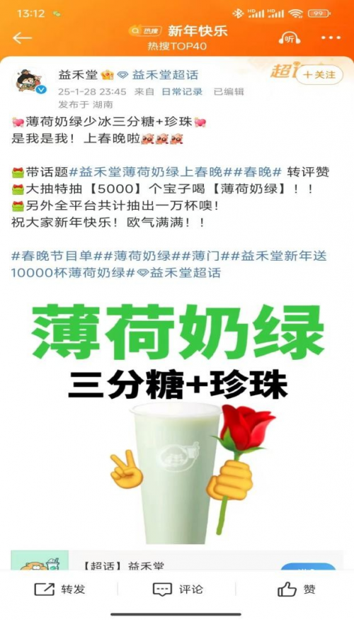 隨著薄荷奶綠在春晚上的“爆火”,不少網友紛紛猜測益禾堂是否也贊助了春晚。雖然這一猜測尚未得到官方證實,但益禾堂與春晚的這次“親密接觸”無疑為其品牌帶來了極大的曝光度和關注度。