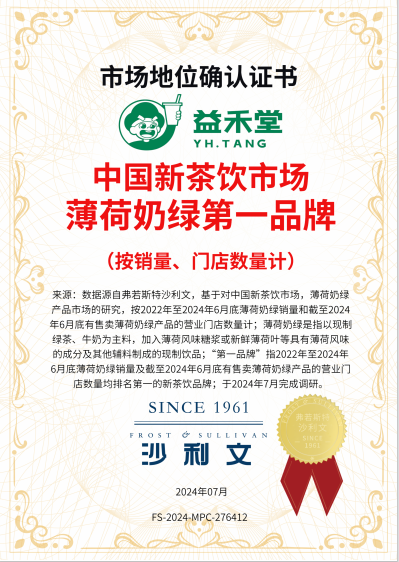 早在去年,益禾堂的薄荷奶綠就已成為繼益禾堂烤奶后的新爆款,上市至今累計銷售破億杯,連續5個月銷量top1,北方市場單品銷售占比近40%。其卓越的品質和口感贏得了市場的廣泛認可,并榮獲了沙利文認證機構授予的“中國茶飲市場薄荷奶綠第一品牌”稱號。沙利文作為全球知名的認證機構,其認證標準嚴格而權威,這一榮譽無疑是對益禾堂薄荷奶綠品質和口感的最好證明。