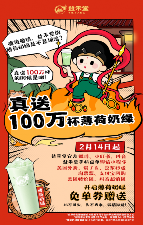 核心提示:2025年開年,茶飲界可謂非常“熱鬧”,其中最大的“顯眼包”非益禾堂莫屬。2025年開年,茶飲界可謂非常“熱鬧”,其中最大的“顯眼包”非益禾堂莫屬。從除夕夜薄荷奶綠意外爆紅,到元宵節喜提熱搜第五、借勢許出預祝《哪吒2》票房破百億送100萬杯薄荷奶綠的豪言壯語,再到情人節踐行承諾,微博、抖音、小紅書三大社交平臺狂送三天。