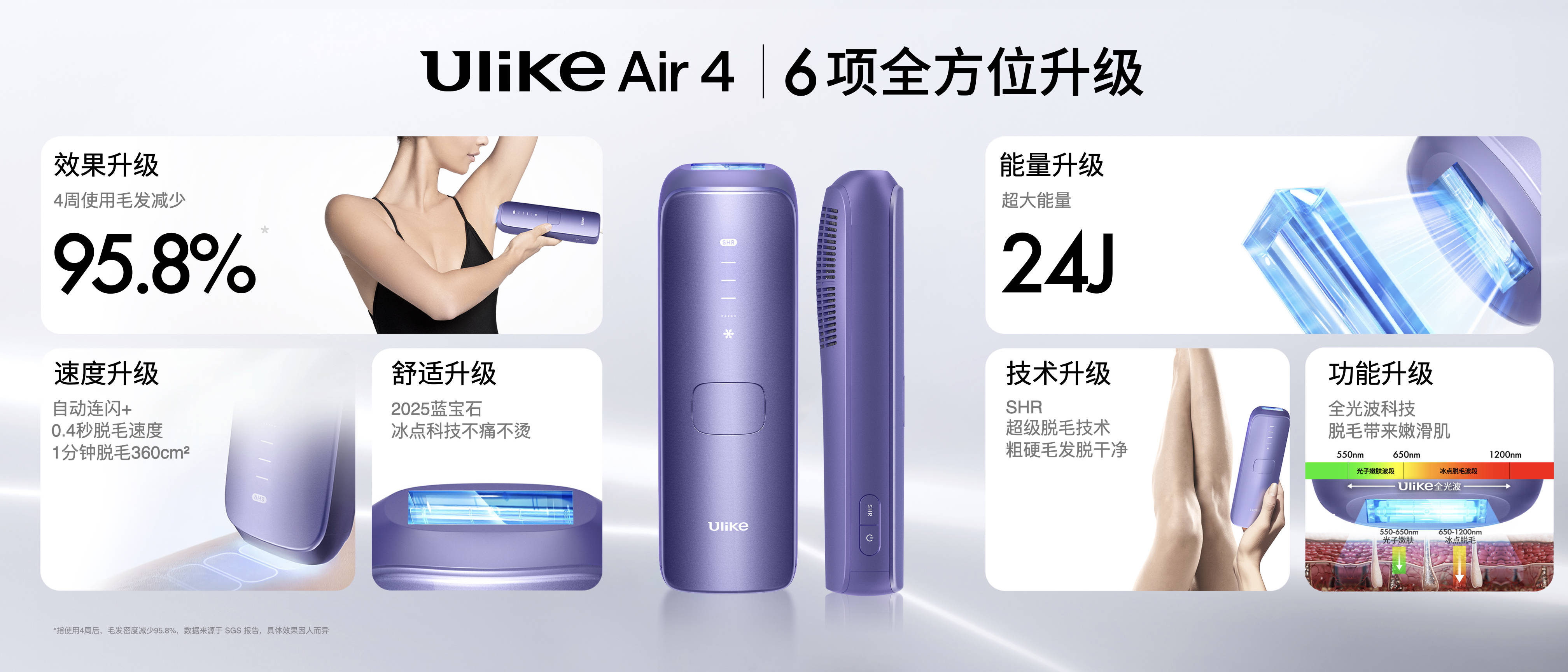 除了“地表最強脫毛儀Ulike Pro 10”,本次發布會上還發布了“Ulike史上最暢銷的脫毛儀Air系列”的新品——Air 4,通過6項全方位升級,使其更適合白領、上班族使用。因為24J超大能量,脫毛效果更好,4周毛發有效減少95.8%。而且,Air 4搭載了高端院線使用的SHR超級脫毛1.0技術,憑借0.4秒的脫毛速度,搭配自動連閃科技,1分鐘能夠脫毛360平方厘米,讓脫毛效率更快更省時。另外,Air 4同樣使用了2025藍寶石冰點科技與全光波科技,讓脫毛帶來嫩滑肌。