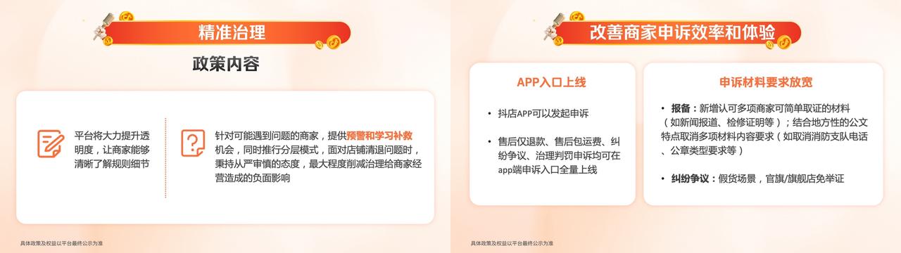如何全方位提升商家體驗?抖音電商以商家需求為服務導向,推出一系列優(yōu)化舉措,包括提升平臺規(guī)則透明度、改善商家申訴效率和體驗、給遇到問題的商家提供預警和學習補救機會等。假如遇到糾紛爭議等問題,也可通過抖店APP發(fā)起申訴,得到圓滿解決。同時抖音電商放寬了申訴材料要求,新增認可多項商家可簡單取證的材料,并且結(jié)合地方性的公文特點取消多項材料內(nèi)容要求,提升取證效率,助力商家早日解決問題。