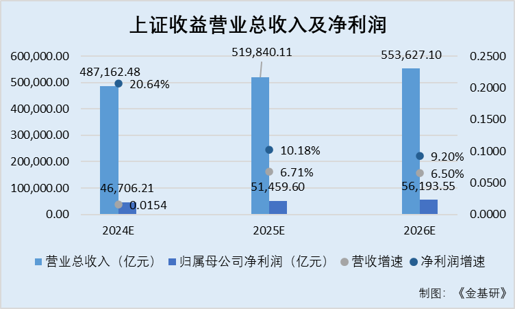 2021-2023年上證收益、上證指數成份股歸屬母公司凈利潤分別為38,753.69億元、38,690.76億元、38,713.82億元,預計2024-2026年歸屬母公司凈利潤分別為46,706.21億元、51,459.6億元、56,193.55億元,預計同比分別增長20.64%、10.18%、9.2%。