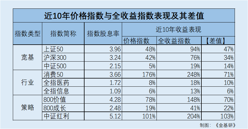 例如,上證50、滬深300、中證500的股息率分別為3.96%、3.24%、2.15%,其全收益指數與價格指數的漲幅差距分別為47%、34%和14%。