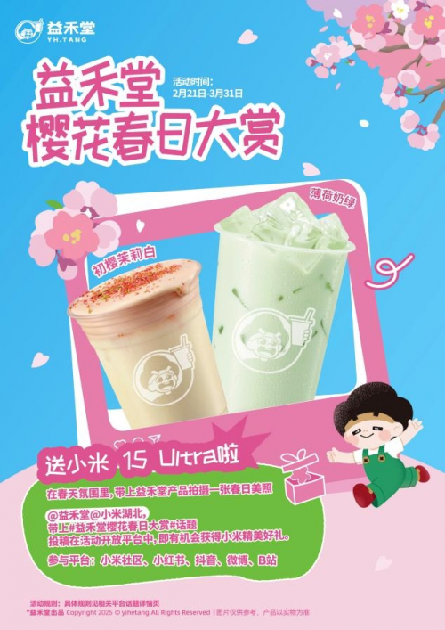 同時,2月27日至3月9日,從微信、支付寶小程序進入購買指定套餐(雙杯)立享88折。周二會員日(3月4日、3月11日)則提供了更多優惠選擇,讓消費者以更低的價格享受到益禾堂的美味飲品,僅限周二當天有效。不僅如此,益禾堂還與小米聯動,發起#益禾堂櫻花春日大賞#話題,在小米社區、小紅書、抖音、微博、B站任意一平臺帶上益禾堂產品拍攝一張春日美照就有機會獲得小米15 Ultra。