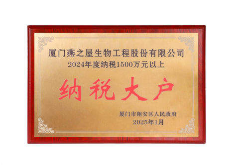 燕之屋以高品質產品踐行美與健康生活的追求,同時積極履行企業責任,獲頒廈門市翔安區"2024年度納稅大戶"榮譽,標志著燕之屋在穩健發展的道路上再添里程碑。燕之屋將持續深化高質量發展戰略布局,以科技創新提升品牌價值,以責任與擔當書寫企業效益與社會經濟同頻發展的新篇章,為區域經濟及社會發展貢獻更多力量。