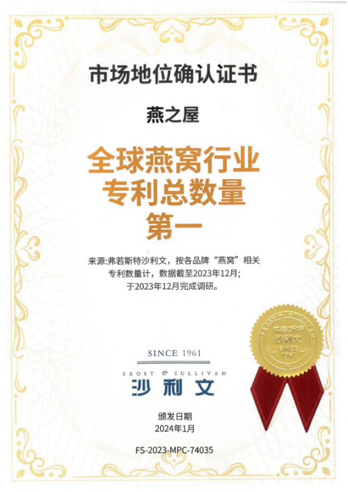 燕之屋蓄力打造從原料溯源到終端消費的全鏈條服務,多方位保障產品品質,同時深耕科技研發,以創新驅動發展戰略,自建燕窩營養研究院,推動燕窩的基礎研究,挖掘燕窩營養價值。2022年,燕之屋燕窩研究院獲評“第三十二批省級企業技術中心”稱號,燕之屋還獲評廈門市“專精特新”中小企業榮譽認證。截止至2025年2月24日,燕之屋擁有國內外授權有效專利190項專利,其中發明專利26項,實用新型專利69項,外觀設計專利95項。研究院發表論文59篇,其中SCI論文18篇,專著2部。經知名咨詢機構弗若斯特沙利文有限公司認證,截至2023年12月,燕之屋在全球燕窩行業專利總數量第一*(*來源:弗若斯特沙利文,按各品牌“燕窩”相關專利數量計,數據截至2023年12月;于2023年12月完成調研)、自主發明專利數量第一*(*來源:弗若斯特沙利文,按各品牌“燕窩”相關自主發明專利數量計,數據截至2023年12月;于2023年12月完成調研),這不僅賦能企業發展煥發蓬勃生機和澎湃活力,也為燕窩產業高質量發展貢獻科技力量。
