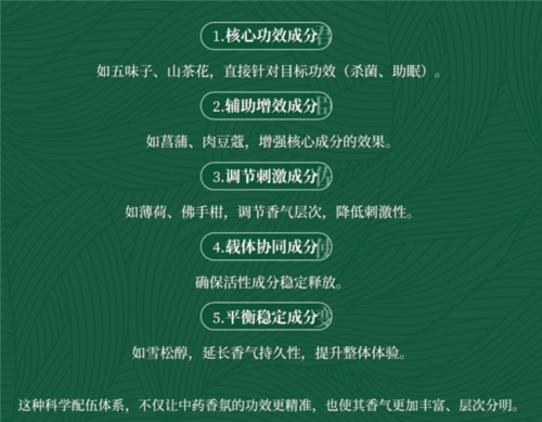 馥房功能香氛基于“中藥揮發(fā)油的多組分協(xié)同性更強(qiáng)(如蒼術(shù)油含蒼術(shù)酮、β-桉葉醇等16種活性成分)”之特點,以“君臣佐使”理論為基礎(chǔ),開創(chuàng)“協(xié)同復(fù)配體系”——以功能協(xié)同性取代機(jī)械比例: