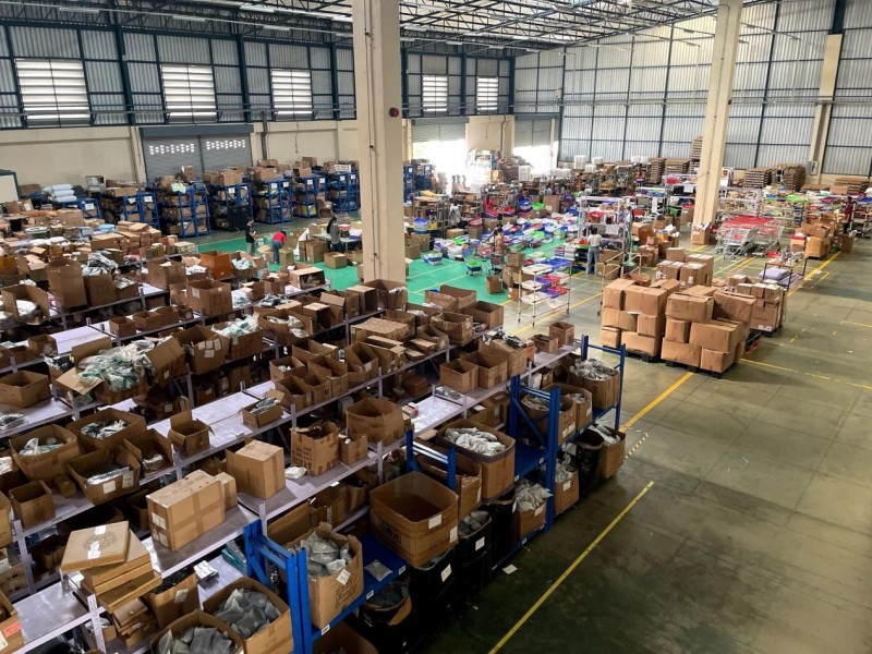 25號下午3點,我們踏入了商舟跨境合作的曼谷喜運達海外倉,映入眼簾的是大型貨架集成、多個工人操作運轉的場景。這座海外倉占地1萬平米的倉儲中心,日均處理訂單量超2萬單,服務了幾十個頭部肩部賣家,覆蓋泰國全境及周邊國家,主要服務平臺為Shopee、Lazada、TikTok Shop。貨架上,“中國制造”的電子產品、家居用品、美妝產品分類清晰,等待24小時內送達消費者手中。