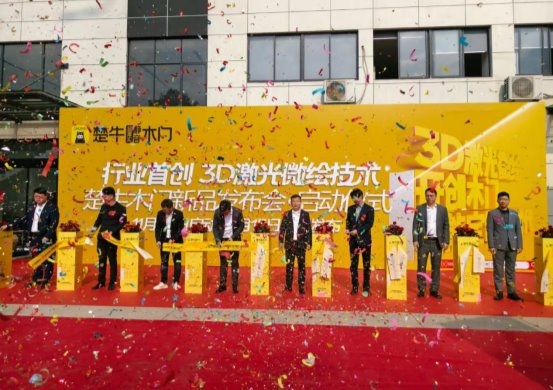 2.行業首創激光工藝木門:楚牛木門通過聯合設備開發、工藝設計、原創IP款式設計,歷時2年首家在行業推出激光工藝木門,將傳統雕刻納米漆只能達到1mm精度,跨越式進入到0.1毫米激光非接觸式加工,超越傳統雕刻8倍,工藝極致,0瑕疵更漂亮。中國木材流通協會木門窗專委會張鵬會長親臨發布會現場致辭,授予楚牛木門行業技術突破與創新特別貢獻獎,上門網董事長吳家剛、門多多抖音-斌哥、明亮面板董事長徐曉明、銳豪面板總經理梅旭、樂楚股份董事長張義、總經理李選隆共同出席見證。