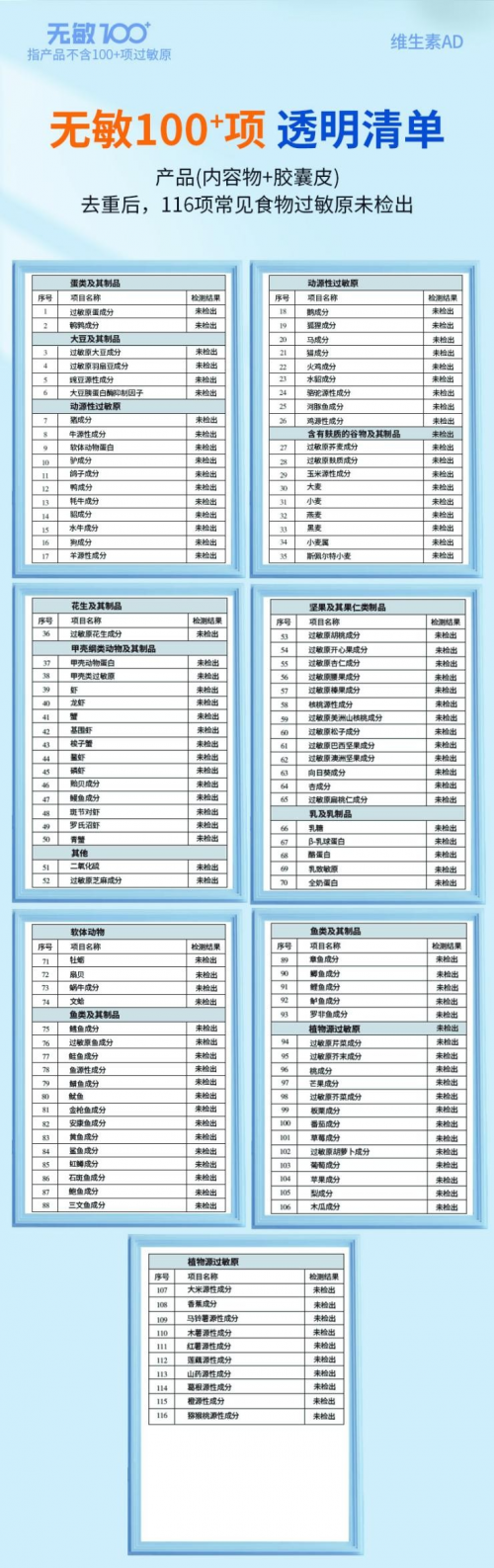 經(jīng)由【華測檢測】檢測,Witsbb健敏思旗下核心產(chǎn)品液體鈣和維生素AD,以116項(xiàng)國際過敏原"未檢出"通過檢測體系,率先達(dá)到“無敏100+”,覆蓋跨國強(qiáng)制標(biāo)注的常見食物過敏原指標(biāo)。
